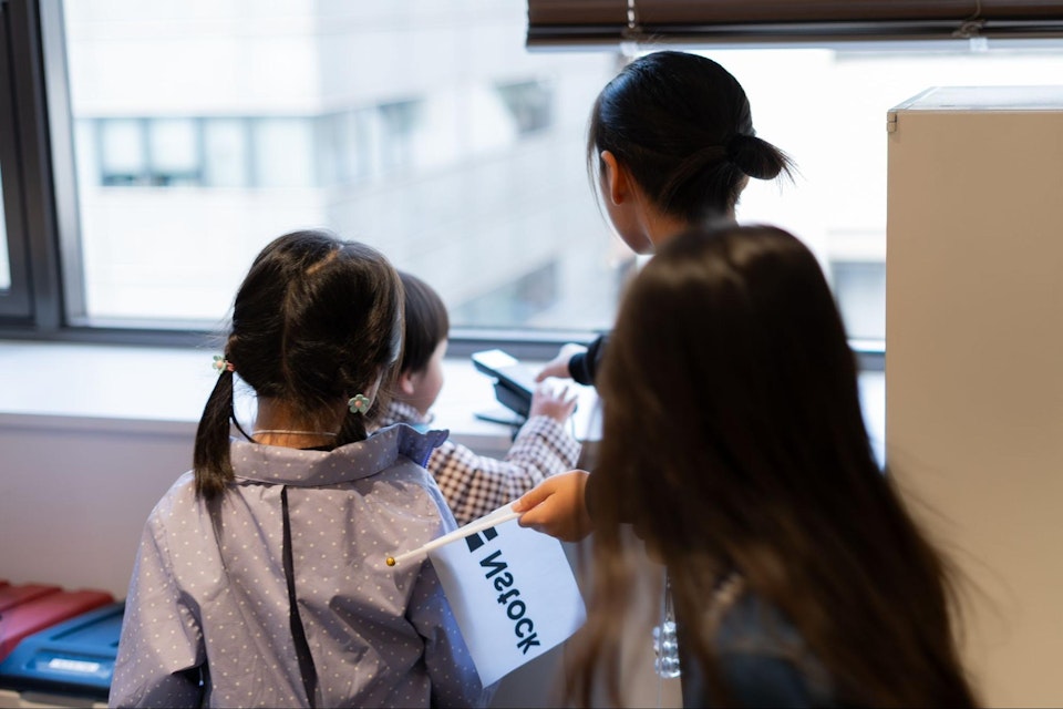 FinGATE KAYABAからほど近いNstockオフィスに移動し、オフィスツアーも開催しました。受付電話や会議ブース、マイク、ホワイトボードなど、目にするものすべてに好奇心を向けながら、パパママの“働く姿”をしっかりイメージしてもらえたようです。“働く場所”を共有することで、家族との距離がぐっと縮まる、大切な時間になりました。また、普段のオフィスでは見られないNstockメンバーの表情も印象的でした。