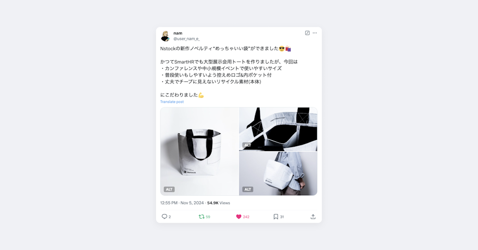 - かつてSmartHRで、大型展示会用に制作したトートバッグが好評だったので、需要や反響を予測できた