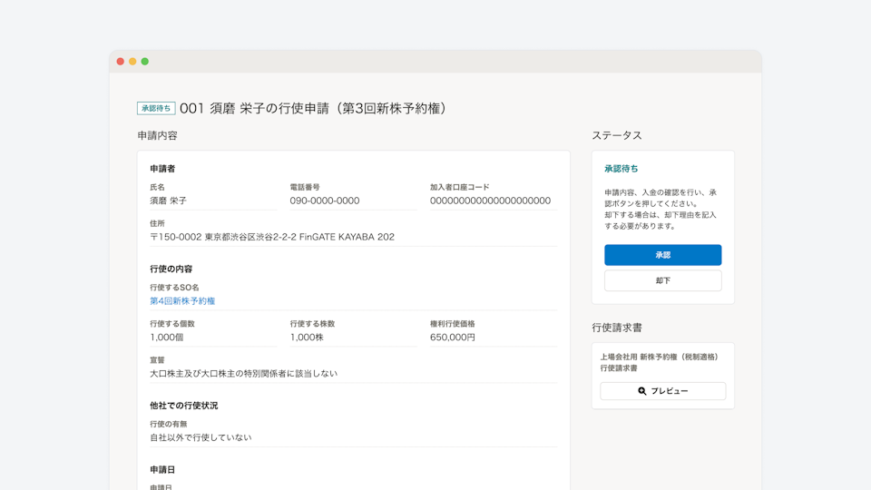 このたびNstockが新たに提供する「行使申請・承認機能」は、ストックオプションの行使申請・承認の手続きと帳票作成が可能です。権利者は、新株予約権割当契約の行使条件に基づき、Nstockの権利者向けマイページから行使したいストックオプションの個数を指定するだけで、行使請求書の作成と事務局への申請がペーパーレスで完結します。事務局が申請内容を承認した際や、証券口座に株式が入庫された際は権利者に通知が行われ、申請の進捗状況をリアルタイムに把握できます。さらに、行使申請の内容は株主名簿管理人や証券会社に提出が必要な帳票類にも反映され、書類作成の業務を効率化できます。