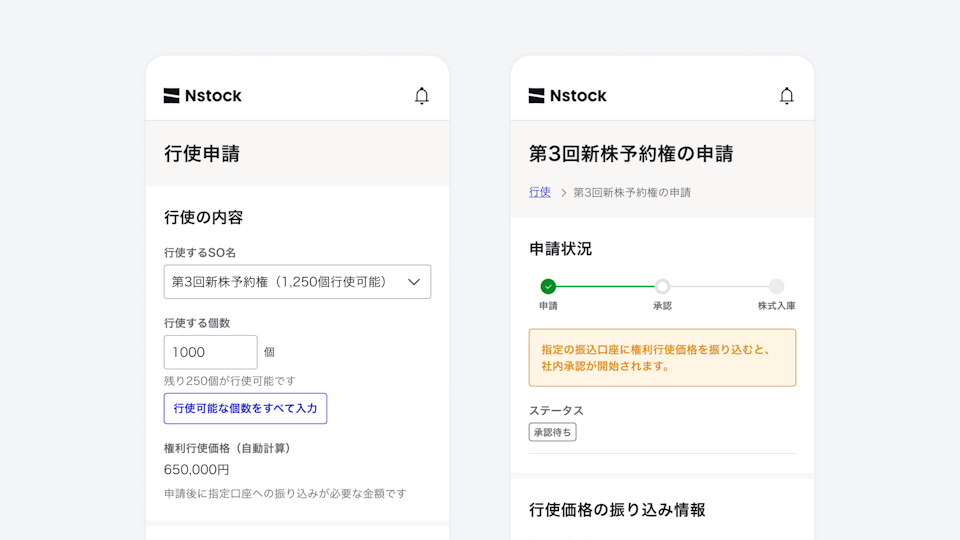 Nstock株式会社(本社:東京都港区、代表取締役CEO:宮田 昇始)が運営する株式報酬SaaS「Nstock」は、権利者(役員・従業員等)によるストックオプションの行使申請と、事務局による承認及び株式交付に必要な帳票作成をNstock上で完結する「行使申請・承認機能」を2024年8月より提供開始したことをお知らせいたします。